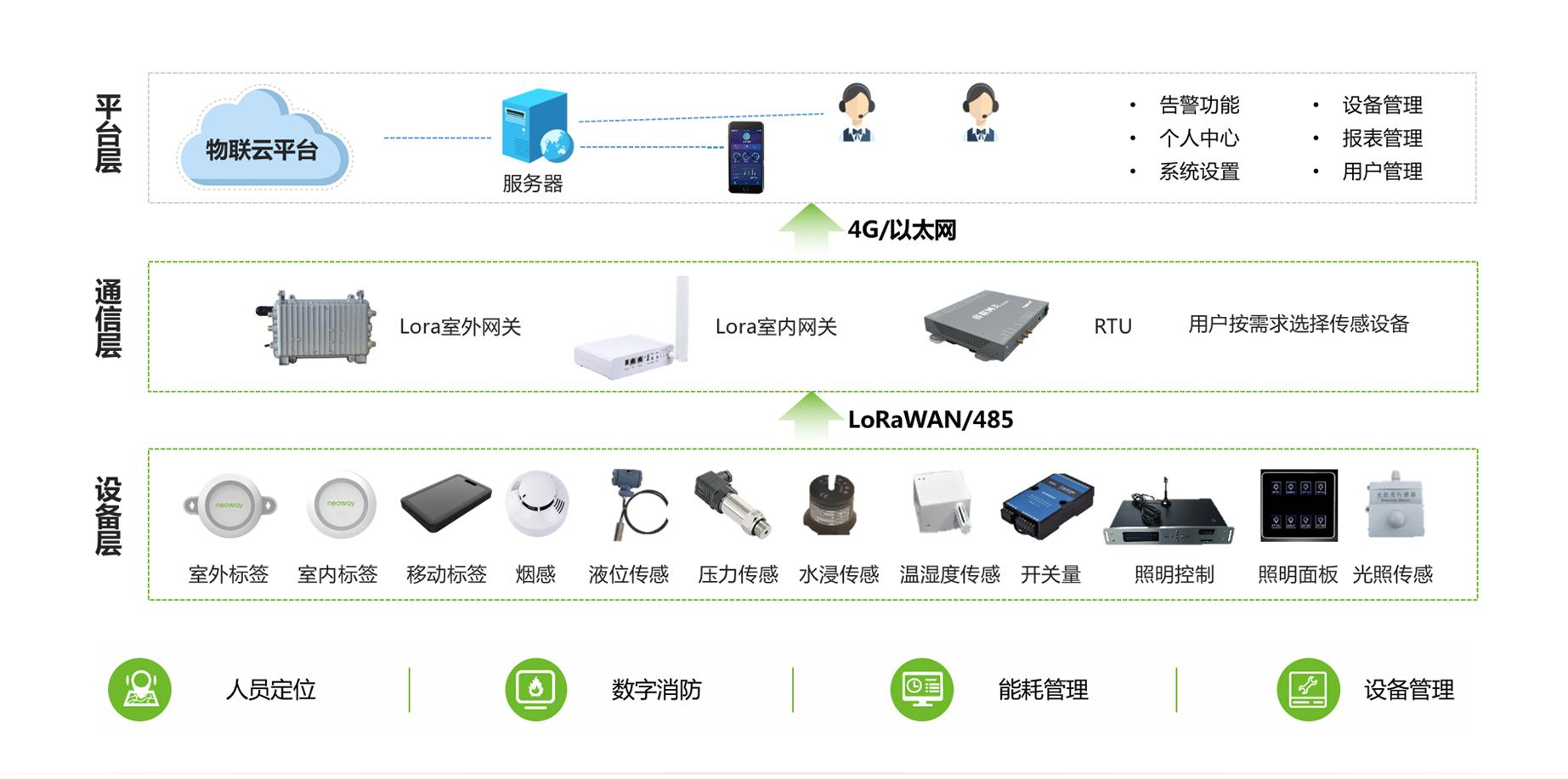 有方科技基于蓝牙、LoRa等组网技术,自主研发智能开放的物业管理解决方案,通过具备边缘计算能力的网关设备接入多种传感器,并将采集的数据上传至平台,进行远程操作管理,为客户提供全方位的智慧物业解决方案。该方案由平台应用层、通信传输层和终端设备感知层组成。包括人员定位、数字消防、设备设施管理等子系统。