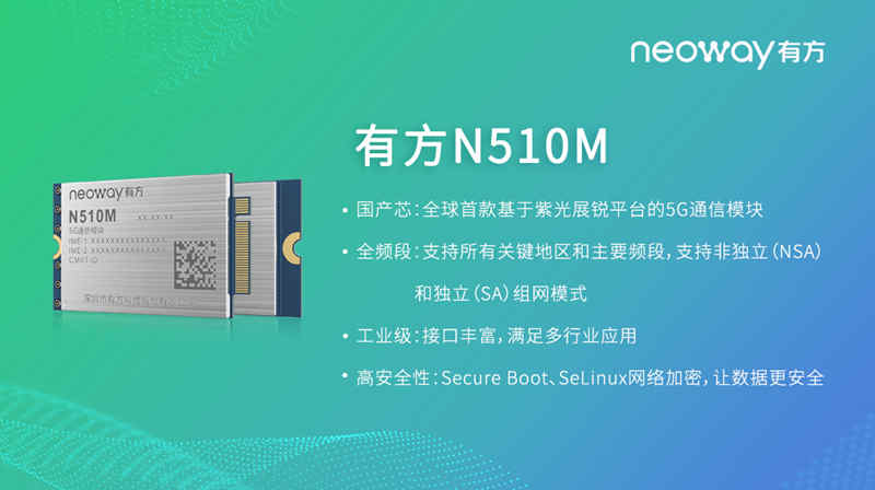 有方科技于2020年初发布的5G工规级模块N510M,是全球首款基于紫光展锐平台的“国产芯”5G通信模块,支持全球关键地区和主流频段,下行速率峰值高达1.95 Gbps;支持SA(独立)和NSA(非独立)组网,向下兼容4G、3G网络;支持网络切片,满足不同业务5G专网分层应用,支持国密技术,让工业生产数据更安全;工业级品质,接口丰富,性能稳定。