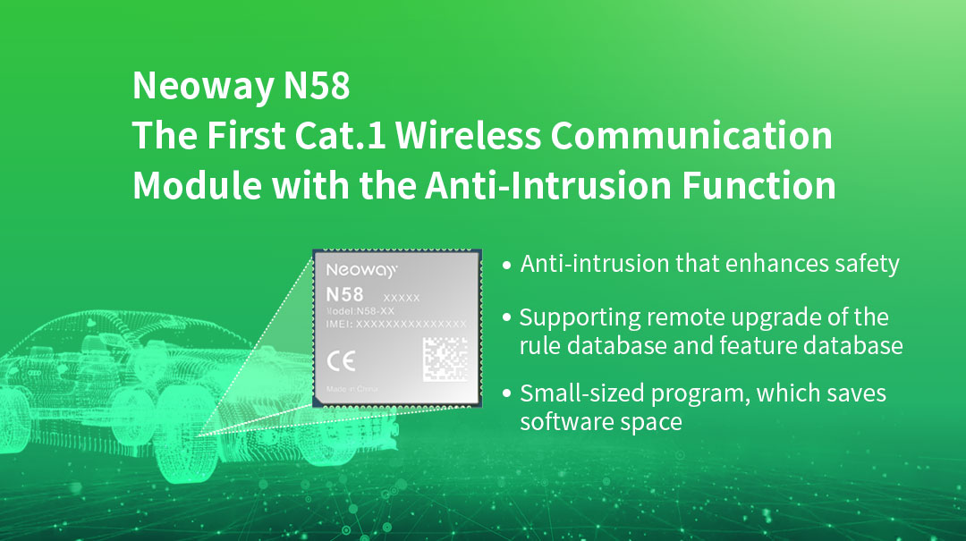 Technical SupportTo improve the Internet of Vehicles (IoV) communication security, prevent malicious attacks, and avoid information leakage, Neoway launched N58 to upgrade the software security protection capabilities and levels. N58 has recently passed the automotive safety test arranged by China Automotive Technology and Research Center Co., Ltd. (CATARC), and become the first Cat.1 wireless communication module with the anti-intrusion function.