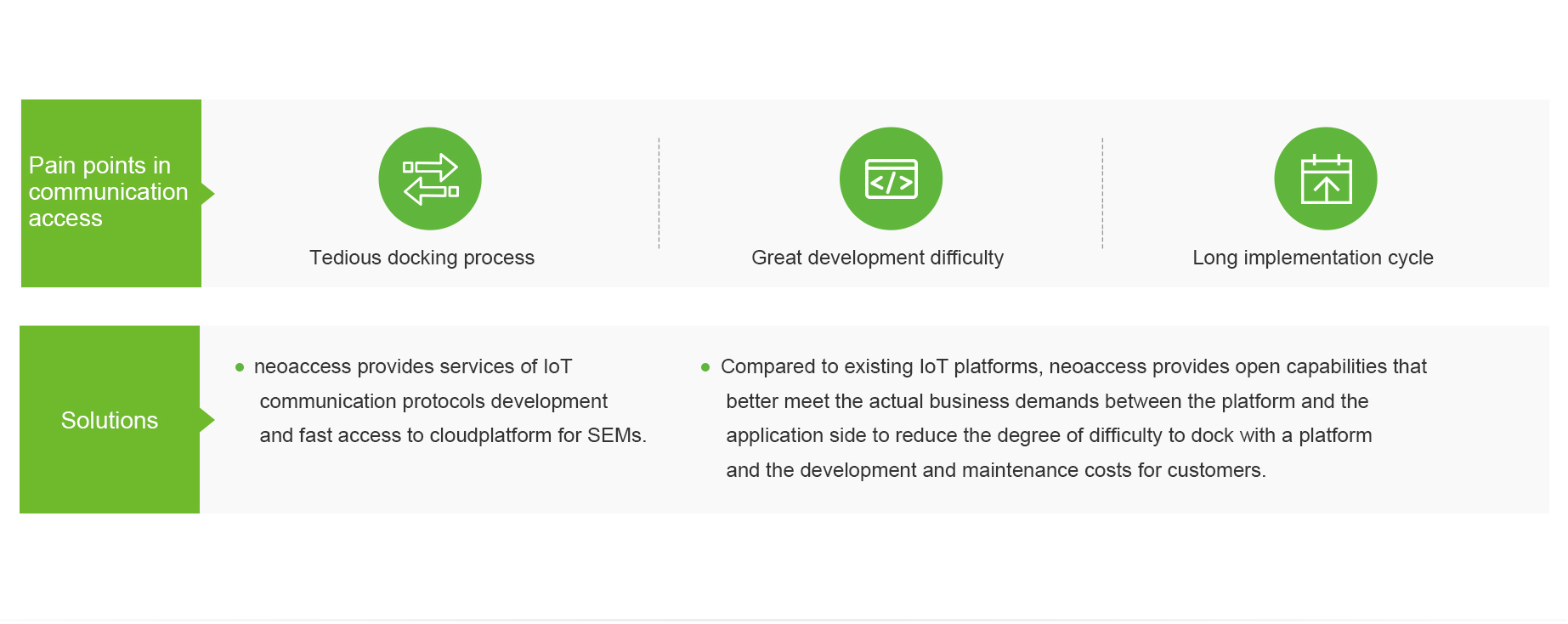 When all kinds of equipment access to the cloud platform, many traditional industries has the pain points such as tedious docking process, great development difficulty, and long implementation cycle. neoaccess cloud can resolve these pain points by eliminating the access difference these equipment and improving the access efficiency.