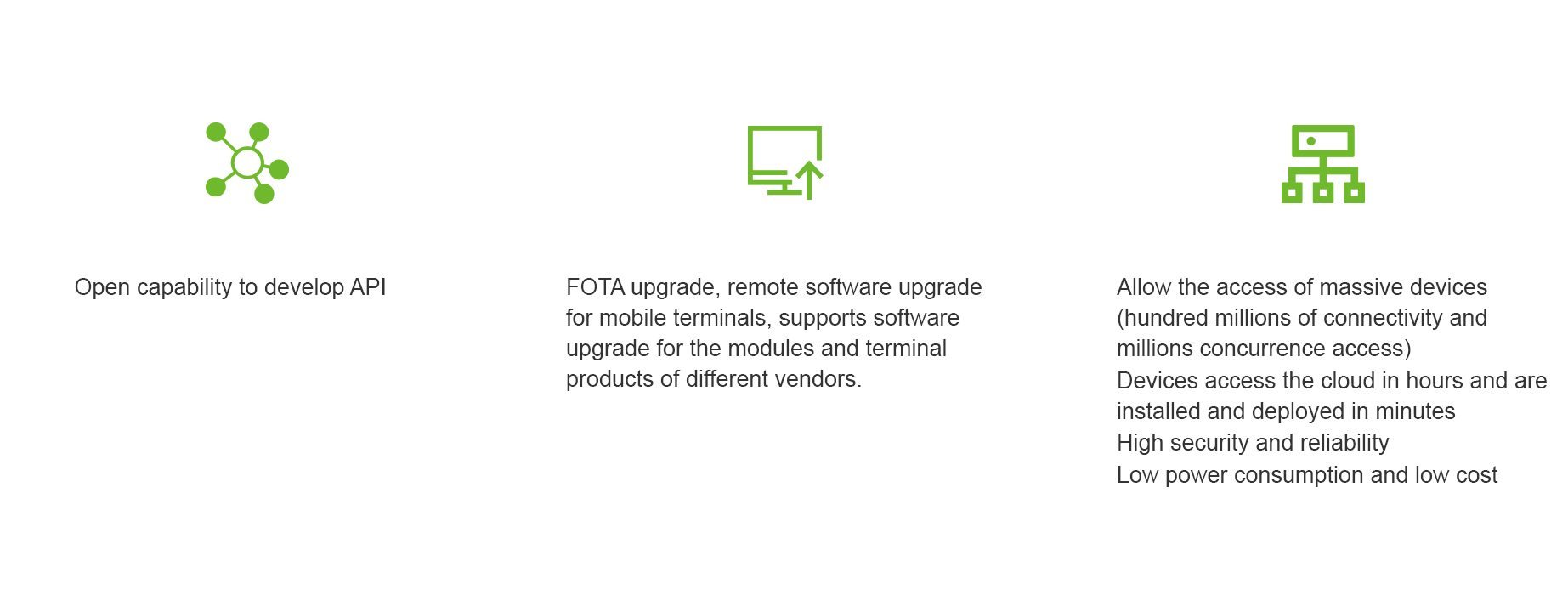 • Providing open and flexible application enablement services for customer’s applications to manage IoT equipment.